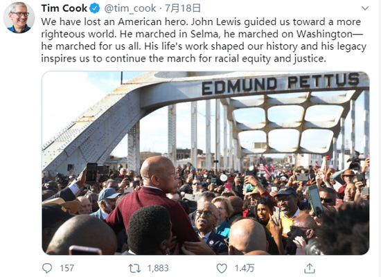 报道称,苹果公司CEO蒂姆·库克(Tim Cook)同时也在推特发文对刘易斯进行了悼念。库克表示,“我们失去了一位美国英雄,约翰·刘易斯引导我们走向一个更正义的世界。”
