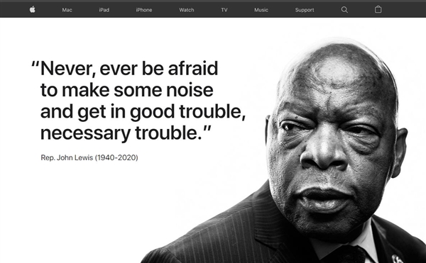7月20日,据媒体报道,苹果公司周日更新了其官网首页内容,以纪念国会议员和著名的黑人民权先驱约翰·刘易斯(John Lewis)。