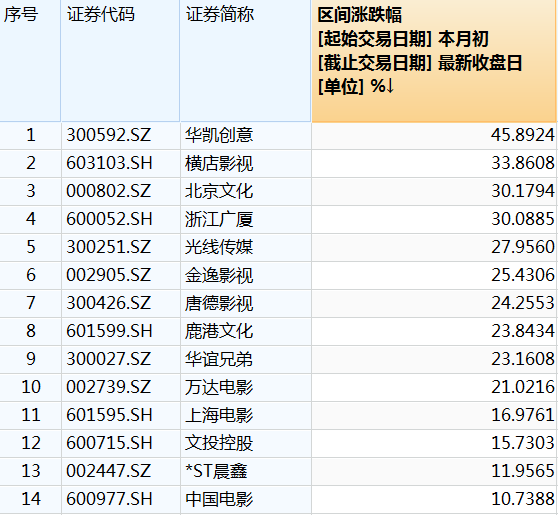 其中华凯创意(19.950, -0.65, -3.16%)、横店影视(21.140, -0.01, -0.05%)、北京文化(8.130, 0.15, 1.88%)和浙江广厦(4.110, -0.30, -6.80%)近20日涨幅均超30%,华凯创意近1月涨幅更是高达77.8%。