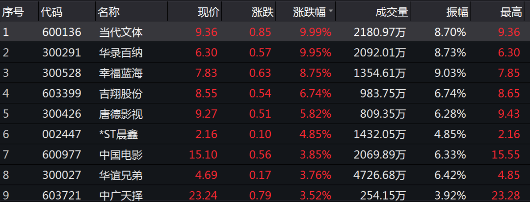 其中当代文体、华录百纳早盘涨停,幸福蓝海(7.910, 0.71, 9.86%)、吉翔股份(8.730, 0.72, 8.99%)、唐德影视(9.330, 0.57, 6.51%)涨超5%。