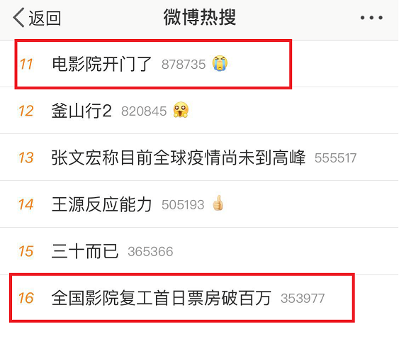 7月20日一大早,两条电影院开门复工的消息就冲上微博热搜,相关话题下也到处都洋溢着网友的激动和感慨。