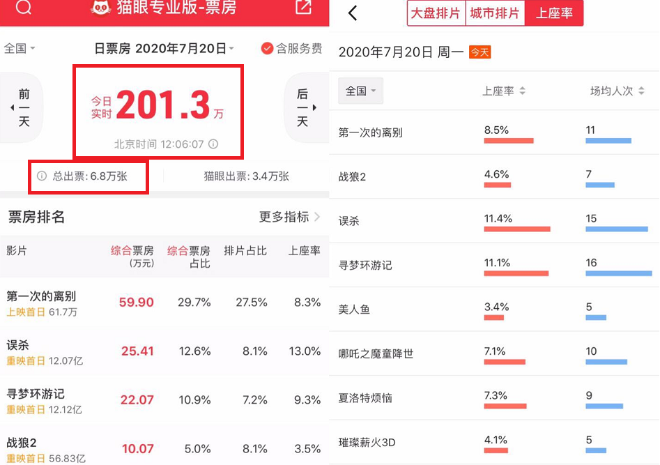 据猫眼专业版数据统计,截至7月20日12时05粉,全国83个城市近400家影院当日的实时票房总额已突破200万元,总出票数近7万张。
