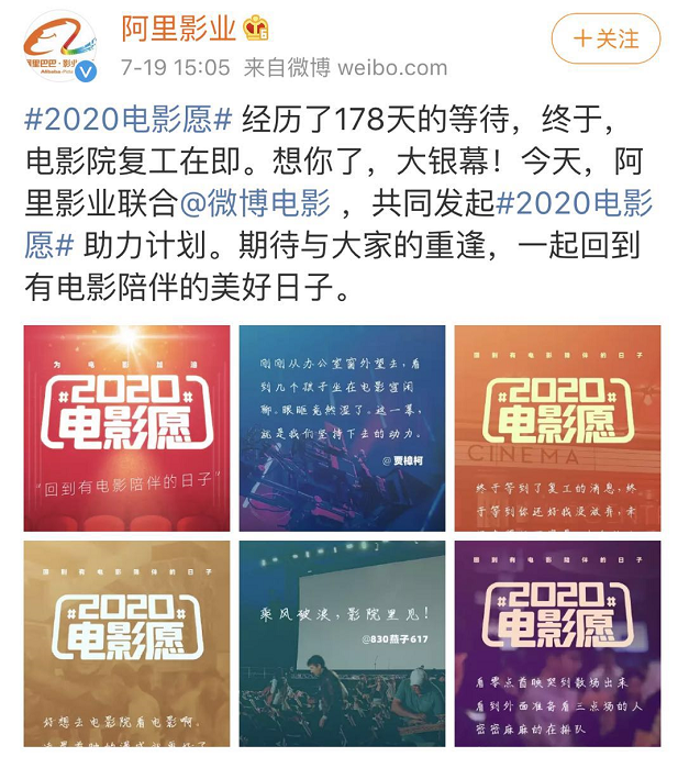 7月19日,为了助力电影行业的发展,阿里影业联合超 30 家公司与平台联合发起“ 2020 电影愿”助力计划,涵盖微博电影、淘票票、猫眼娱乐、爱奇艺影业、博纳影业等。