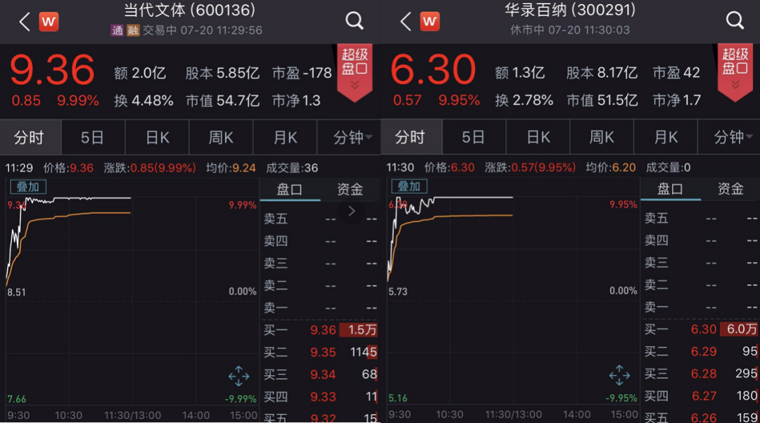 与此同时,二级市场上,影视板块的市场情绪也十分高昂,上周四电影院复工消息一出,相关概念股立刻开始躁动。今日(7月20日)A股开盘,影视板块更是多股走高,其中当代文体(9.360, 0.85, 9.99%)、华录百纳(6.300, 0.57, 9.95%)早盘涨停。